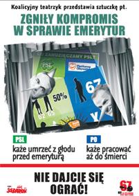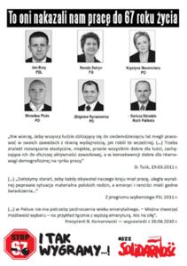 Zwracamy się do związkowców, pracowników i mieszkańców naszego regionu z apelem o poparcie akcji informacyjnej i protestacyjnej NSZZ „Solidarność” przeciw podwyższaniu wieku emerytalnego. Rządowe propozycje nie przyczyniają się do poprawy sytuacji obecnych i przyszłych emerytów. Nie rozwiązują też żadnego z narastających problemów społecznych: bezrobocia wśród młodzieży i pracowników z dłuższym stażem pracy, a szczególnie niskich płac i niepełnych „śmieciowych” umów. Jedynie wzrost zatrudnienia, podniesienie płac i stałe umowy, z pełnym ubezpieczeniem pomogą uzdrowić system ubezpieczeń społecznych.
